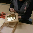 今は都内に住んでいるものの生まれた時からここで育ったというオーナーが、この町家がどんな建物で、どんな思いでこのプロジェクトに提供するに至ったかを思い出とともに語り、その思いを受けてリノベーションに携わったNPO法人金澤町家研究会の建築士が実際の苦労と金沢市内の他の町家の現状の様子などを語り、さらに初代入居者の秋友さんが入居していた頃の様子を語った後、自身が指導しながら金工細工を体験してもらうという、もりだくさんのワークショップです。